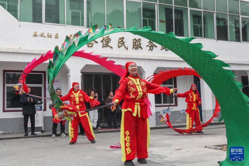 1月23日,在河南省焦作市博爱县柏山镇奉义社区,博爱空竹舞龙艺术团的艺人们为群众表演节目。新华社发(程全摄)