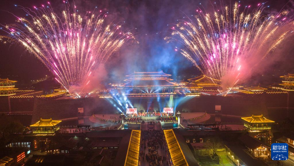 1月22日,游客在湖北省襄阳市唐城景区观看烟花灯光秀(无人机照片)。新华社发(杨东摄)
