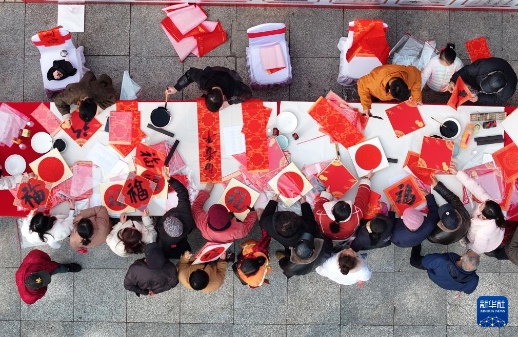 1月23日,湖南省衡阳市衡东县文体广场,书法爱好者为群众书写对联、福字(无人机照片)。新华社发(曹正平摄)
