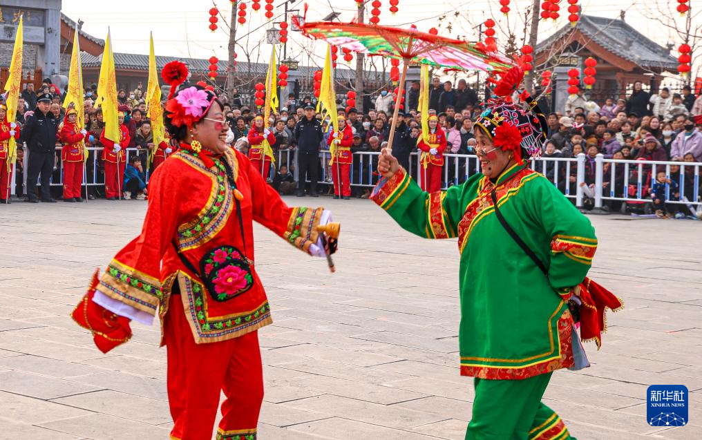 1月23日,在山东省荣成市上庄镇大集,民间艺人在表演渔家秧歌。新华社发(李信君摄)