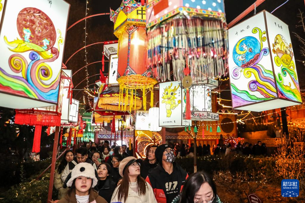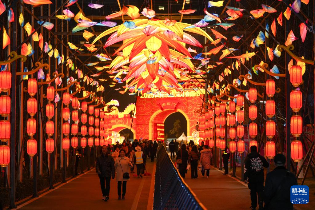 1月23日,游客从河南省开封市翰园碑林景区布置的大型彩灯造型景观前走过。新华社发(李俊生摄)