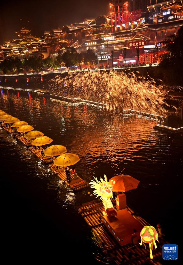 1月22日,民间艺人在湖北省宣恩县贡水河上表演打铁花。新华社发(宋文摄)