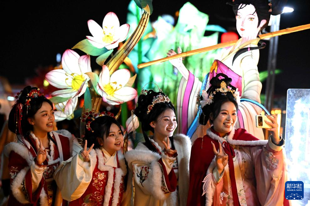 1月22日晚,游客在河北省石家庄市正定古城南城门观赏花灯时拍照。新华社发(陈其保摄)