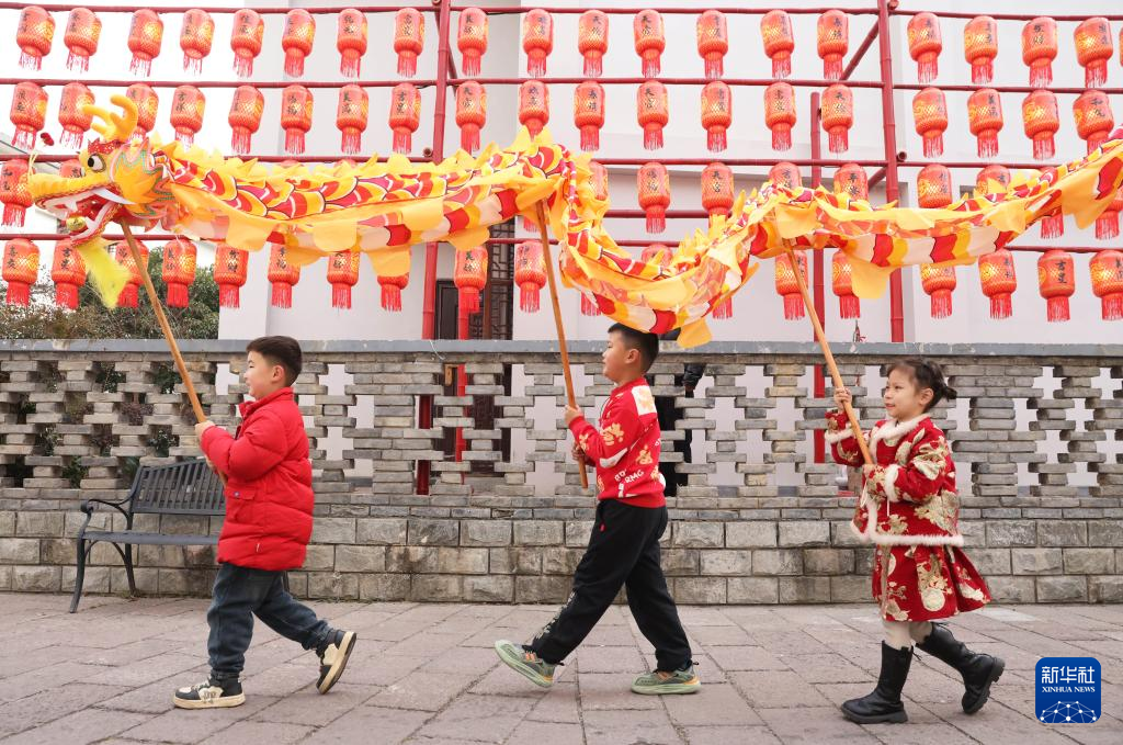 1月23日,在浙江省湖州市德清县乾元镇余不弄,德清县中心幼儿园的小朋友在舞龙。新华社发(倪立芳摄)