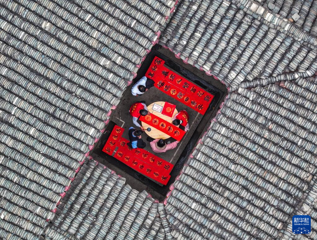 1月22日,湖南省永州市道县梅花镇贵头村,文化志愿者在写春联(无人机照片)。新华社发(蒋克青摄)