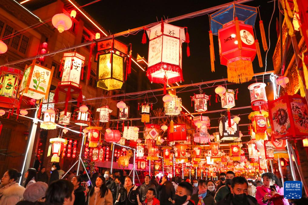 1月22日,游客在甘肃省定西市陇西县北关正街上赏灯游玩。新华社记者 郎兵兵 摄