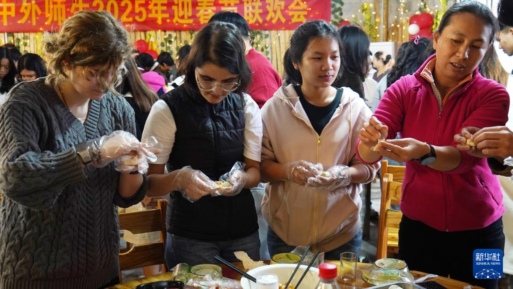 1月23日,在广西桂林市广西师范大学育才校区,外国留学生在中外师生迎新春联欢会上包饺子。新华社发(刘君摄)