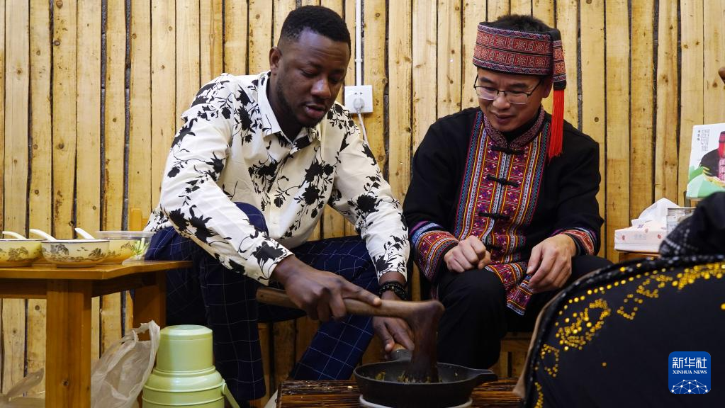 1月23日,在广西桂林市广西师范大学育才校区,几内亚留学生阿布(左)在中外师生迎新春联欢会上体验恭城油茶制作。新华社发(刘君摄)