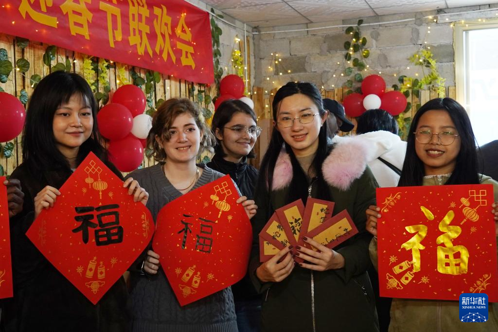 1月23日,在广西桂林市广西师范大学育才校区,外国留学生在中外师生迎新春联欢会上展示自己写的“福”字。新华社发(刘君摄)