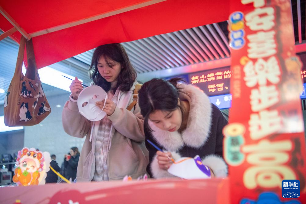 1月23日,在重庆北站候车厅内的新春集市上,候车旅客在画脸谱。新华社记者 唐奕 摄