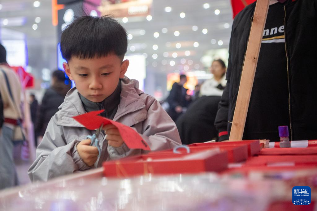 1月23日,在重庆北站候车厅内的新春集市上,一名小朋友在学剪窗花。新华社记者 唐奕 摄
