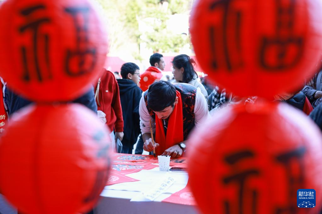 1月23日,在浙江省丽水市青田县方山乡举行的2025浙江侨乡中国年活动上,外国友人现场写福字。新华社记者 江汉 摄