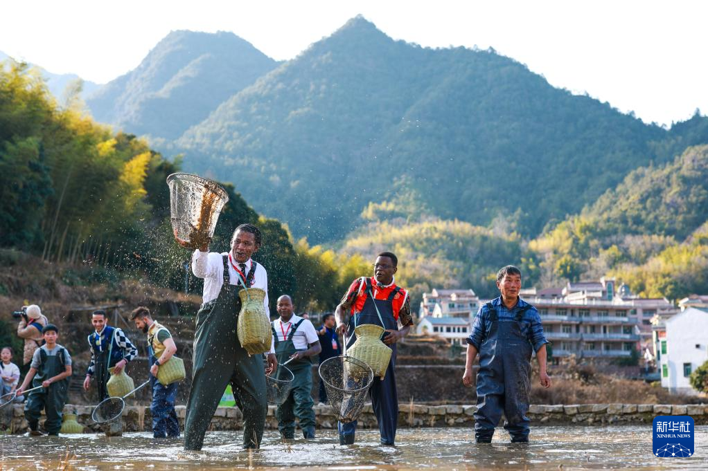 1月23日,在浙江省丽水市青田县方山乡举行的2025浙江侨乡中国年活动上,外国友人在稻田内体验捕捞田鱼。新华社记者 江汉 摄