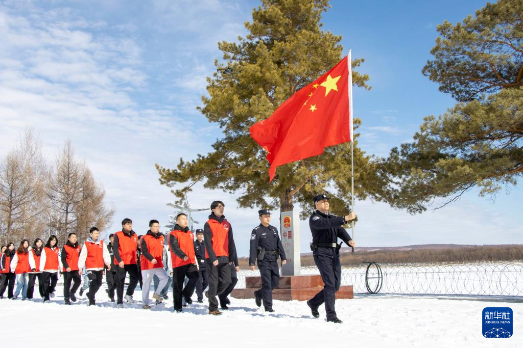 4月14日,在黑龙江省呼玛县,呼玛县团员代表、西部计划志愿者与黑龙江出入境边防检查总站呼玛边境管理大队的青年戍边民警同走戍边路,感受戍边艰辛,提升国家安全意识。新华社发(褚福超摄)