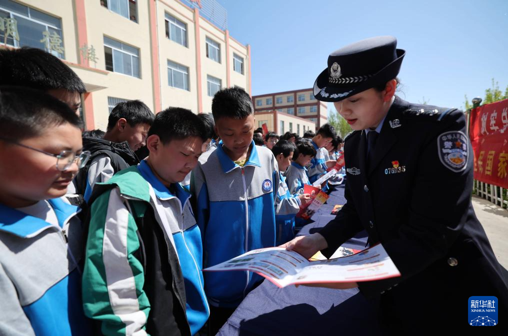 4月14日,警务人员在河北省遵化市第一中学给学生讲解国家安全知识。新华社发(刘满仓摄)