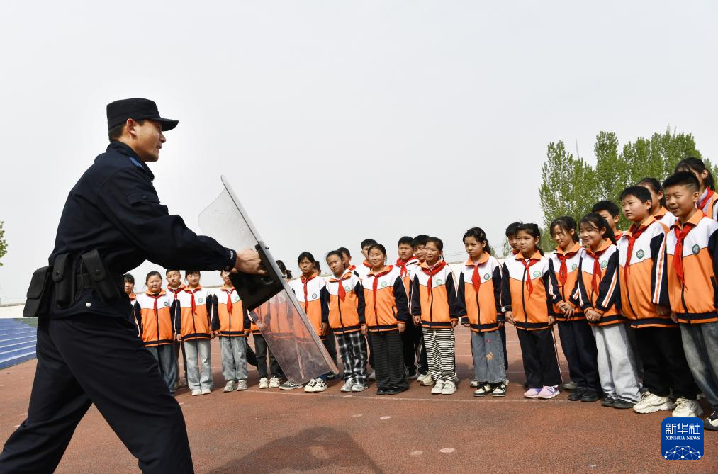 4月14日,在山东省枣庄市山亭区桑村镇中心小学,民警向小学生演示防爆盾牌的使用方法。新华社发(李宗宪摄)