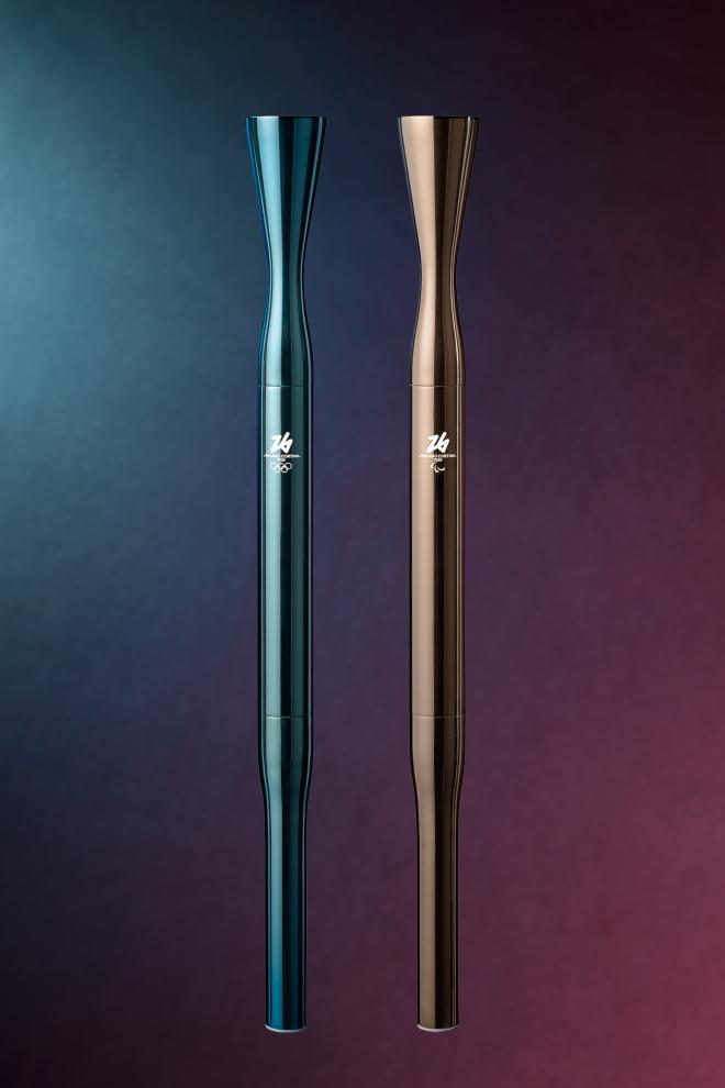 在大阪·关西世博会意大利馆展出的2026年米兰-科尔蒂纳丹佩佐冬奥会火炬(左)和冬残奥会火炬