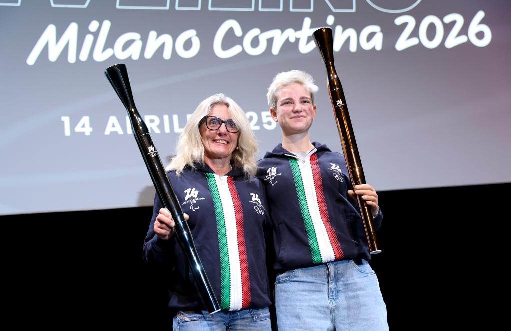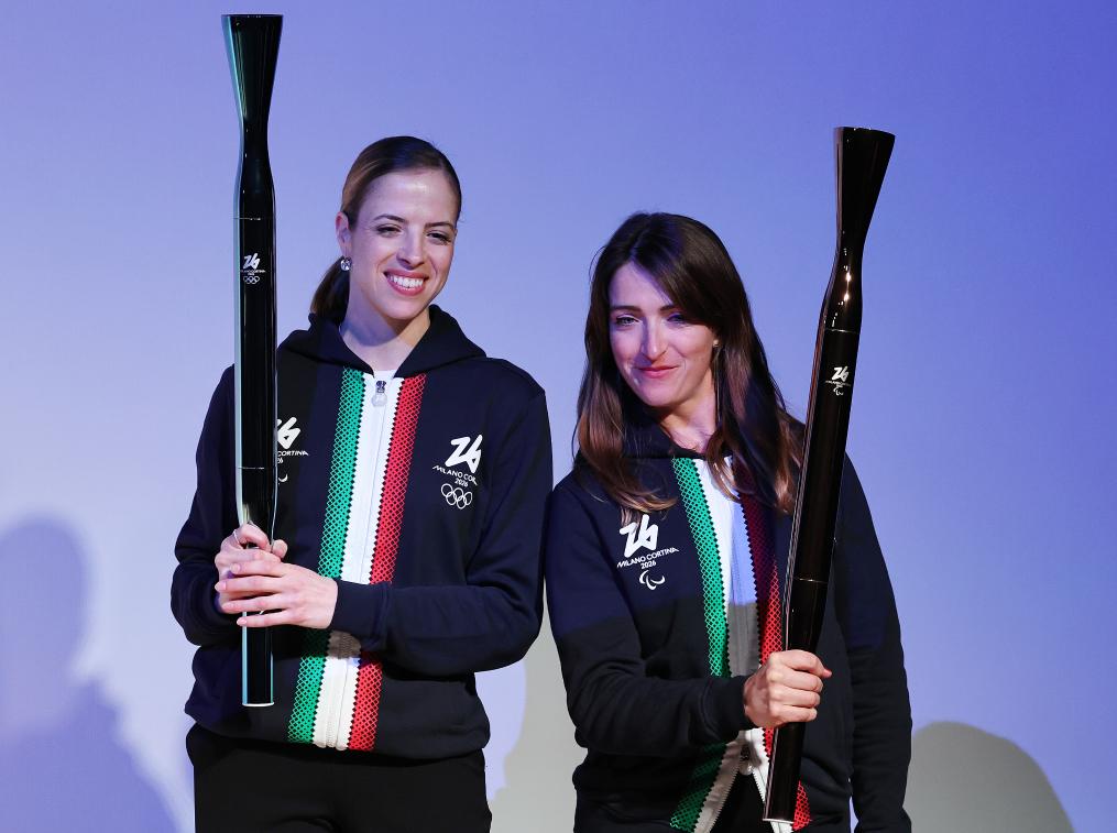 4月14日,冬奥会冠军斯特凡妮娅·贝尔蒙多(左)和残奥会冠军贝贝·维奥在米兰举行的发布活动上展示火炬