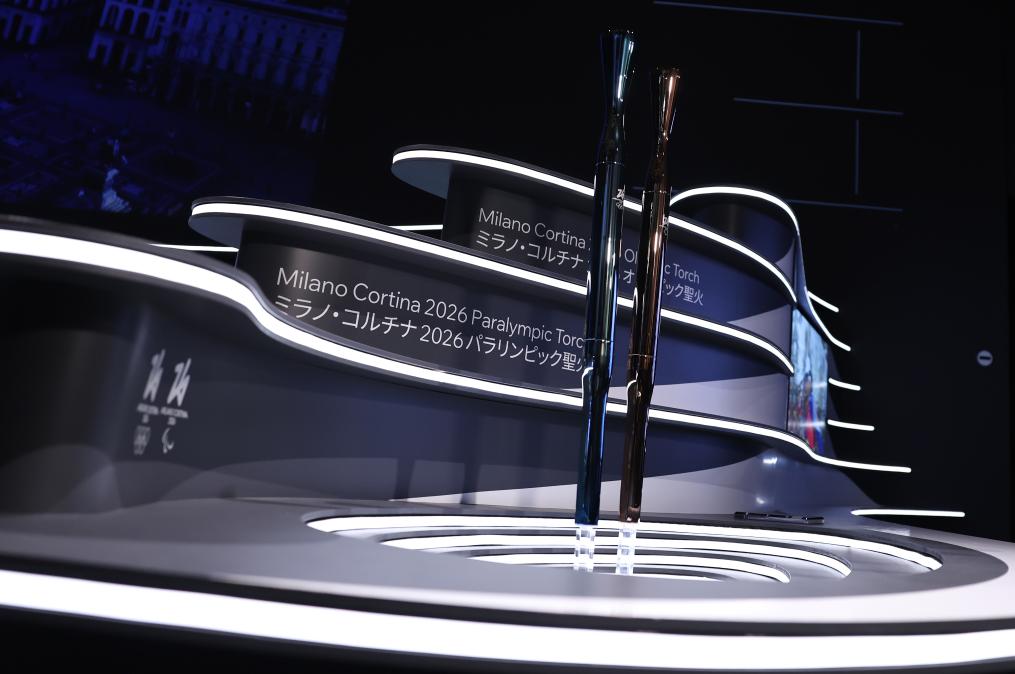 这是4月14日在米兰发布活动现场拍摄的2026年米兰-科尔蒂纳丹佩佐冬奥会火炬(左)和冬残奥会火炬