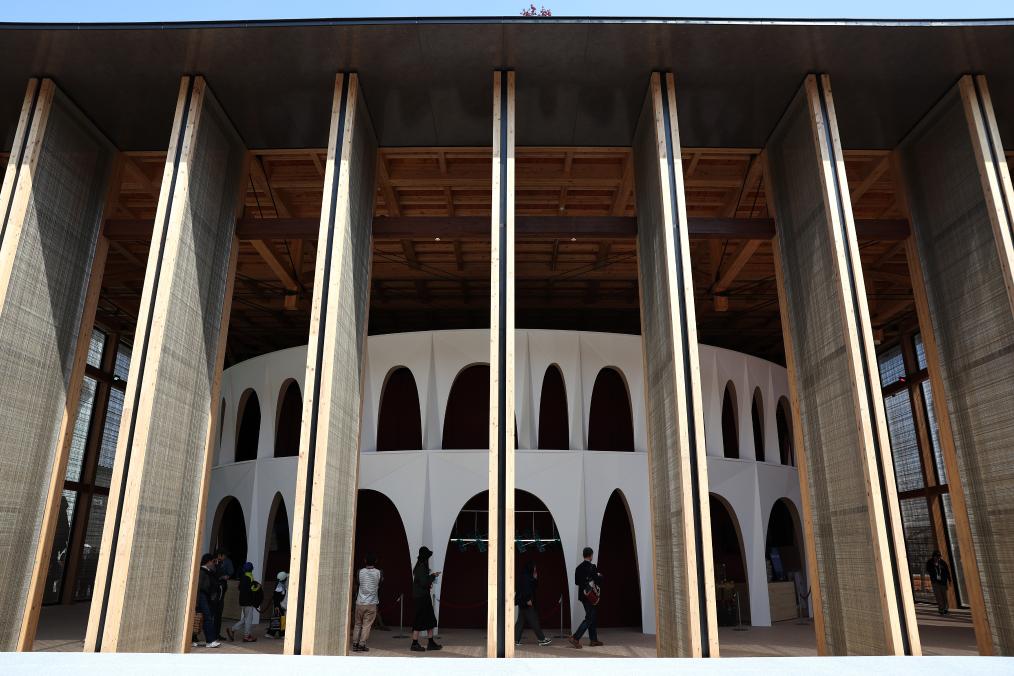 4月14日,游客在日本大阪参观世博会意大利馆