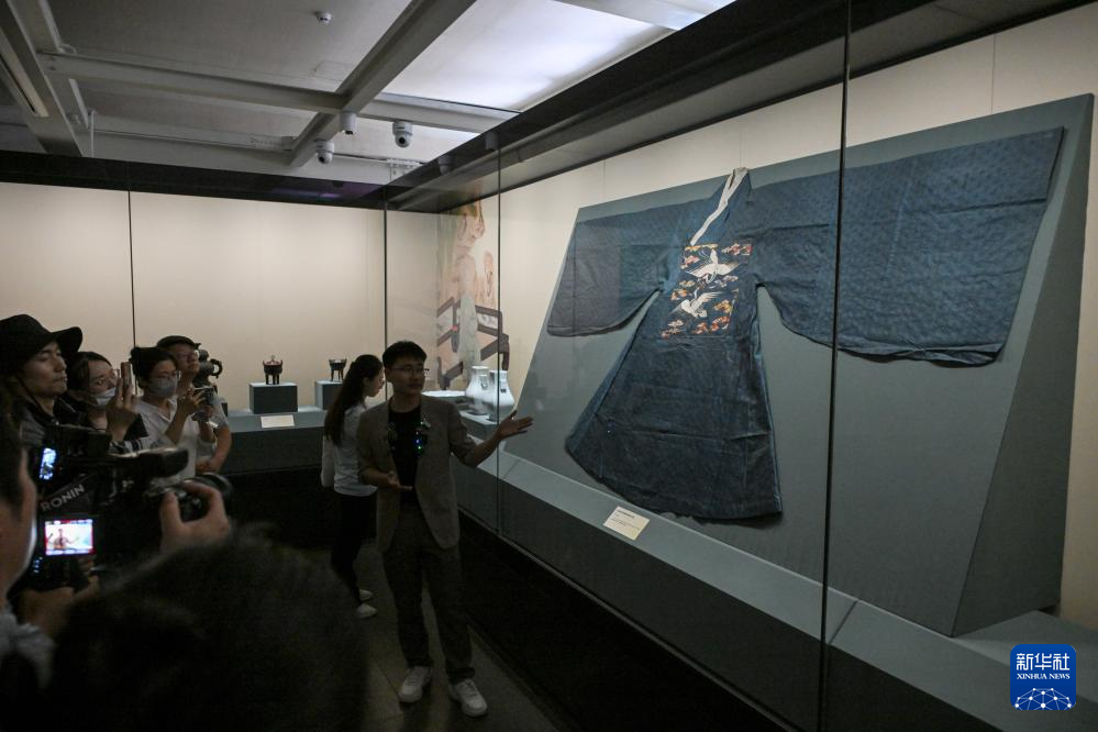 这是展出的明代蓝色暗花纱缀绣仙鹤方补袍(5月19日摄)。新华社记者 金良快 摄