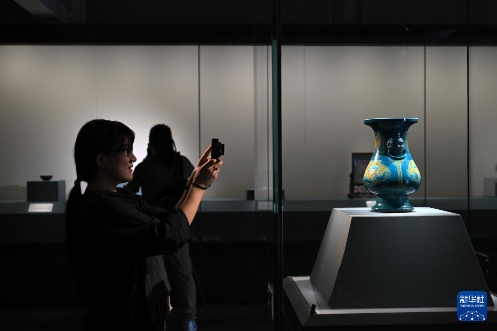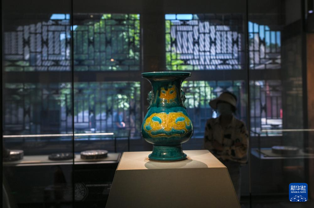 5月19日,记者拍摄展出的清代珐华三彩刻划兽面纹铺首耳琵琶尊。新华社记者 金良快 摄