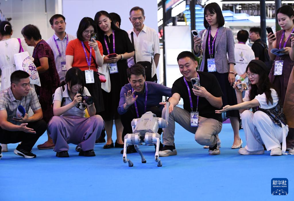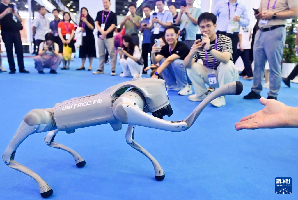 9月19日,在广西南宁国际会展中心,机器狗与参观者互动。新华社记者 陆波岸 摄
