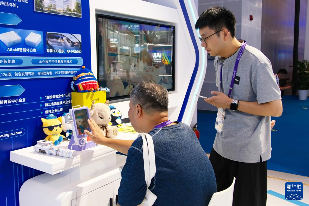 9月19日,在南宁国际会展中心,参观者体验一款裸眼3D的AI儿童陪伴机器人。新华社记者 胡秋思 摄