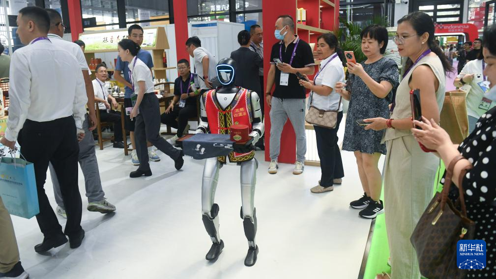 9月19日,在南宁国际会展中心六堡茶展厅,人形机器人端茶叶进行展示。新华社记者 张爱林 摄