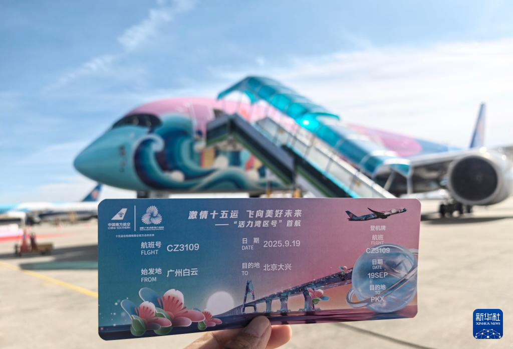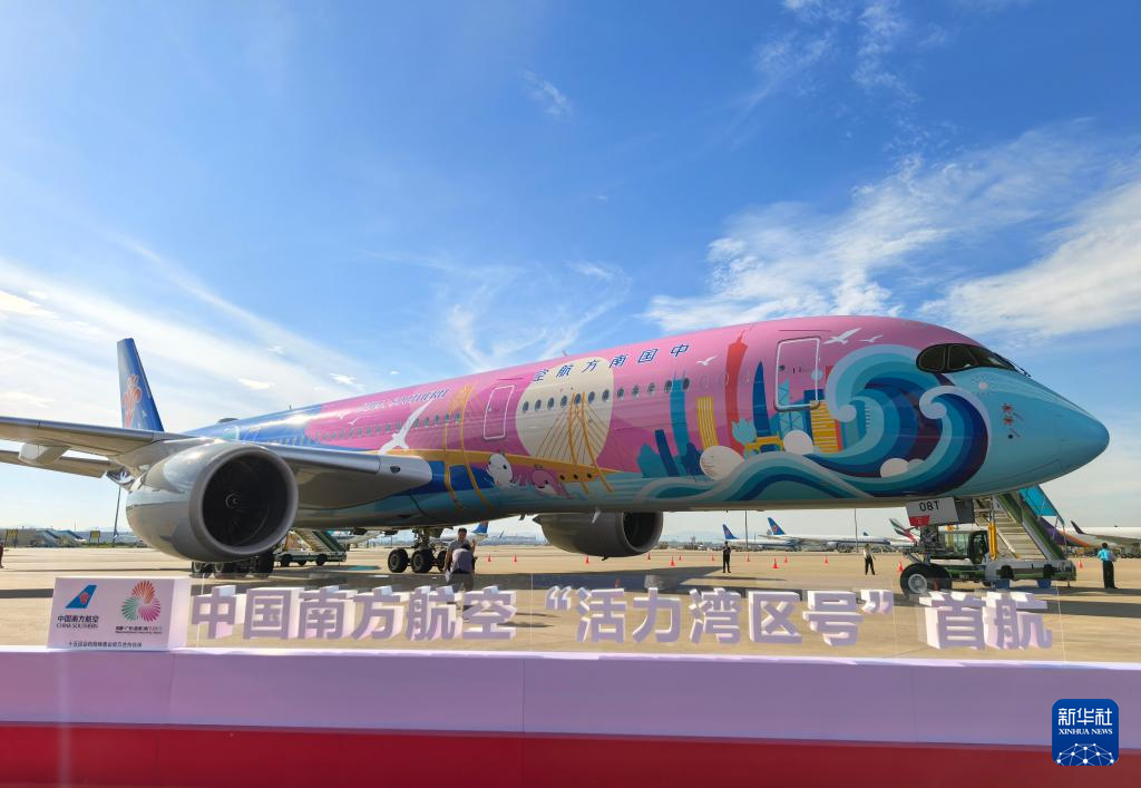 9月19日下午,中国南方航空首架十五运会主题彩绘飞机“活力湾区号”首航,搭载309名乘客从广州白云国际机场飞往北京大兴国际机场。“活力湾区号”机身以蓝、粉、黄等色彩串联,融合了港珠澳大桥、十五运会吉祥物“喜洋洋”和“乐融融”、海鸥及木棉花等元素。