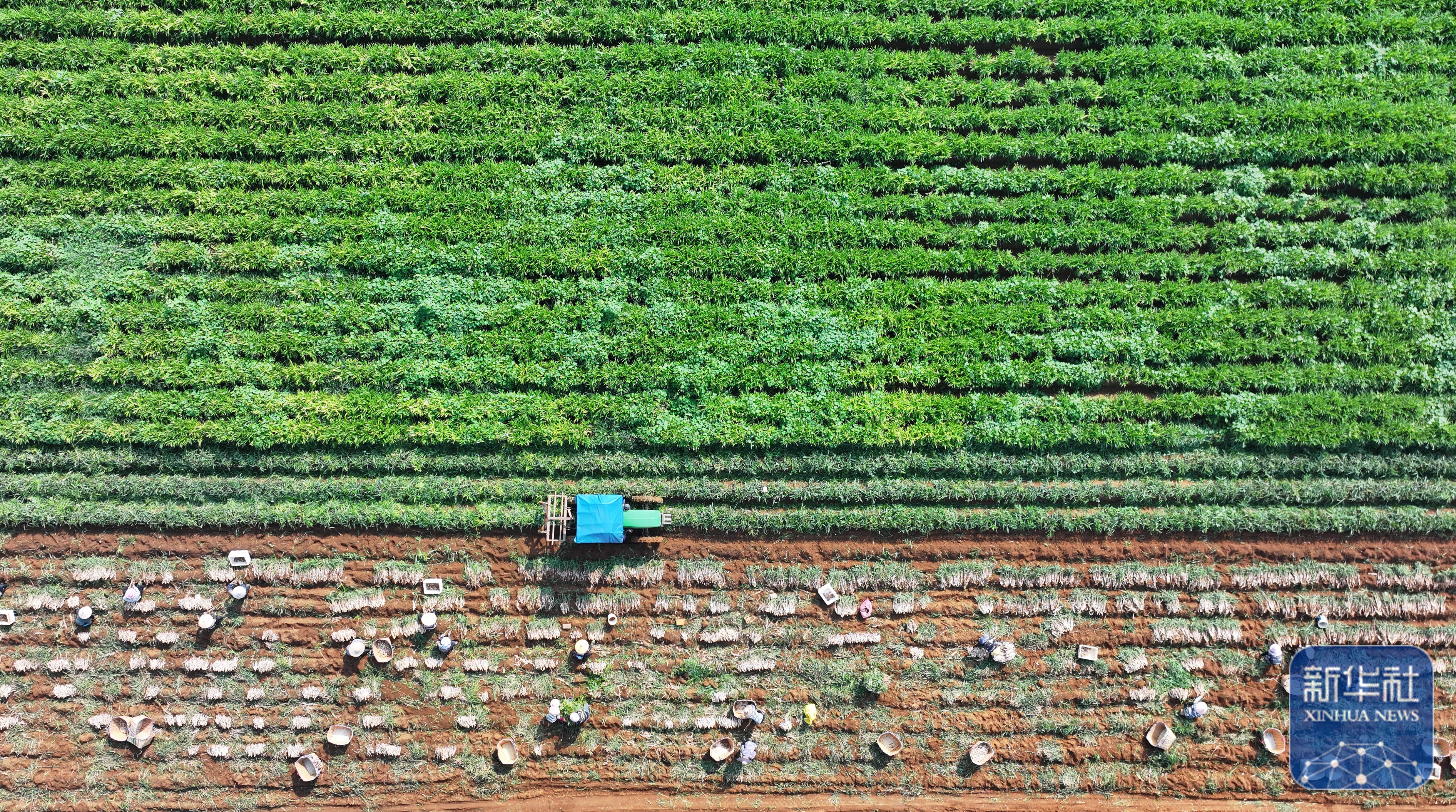 9月19日,在广西柳州市柳城县马山镇,工人在收获子姜(无人机照片)。新华社发(汤晓逵摄)