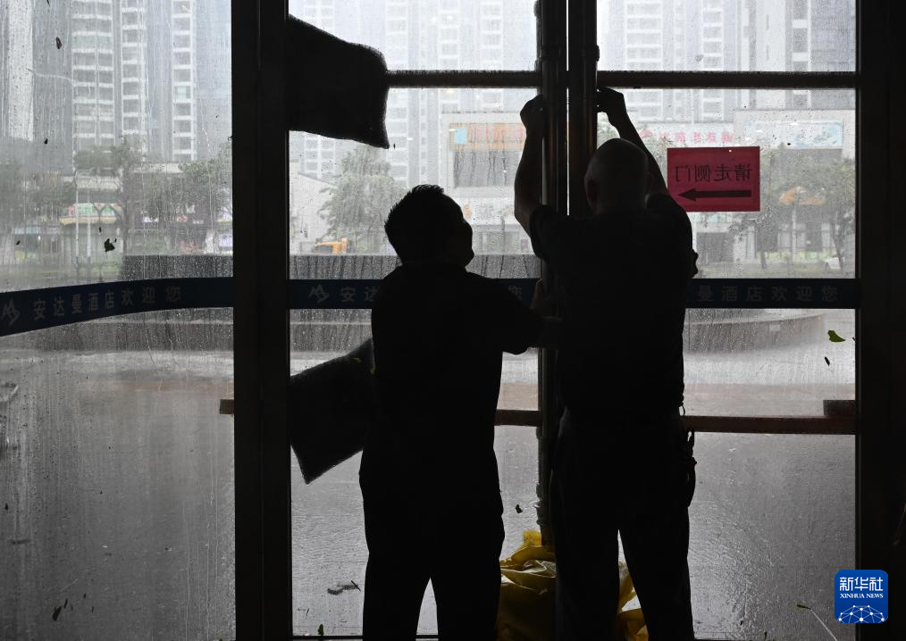 9月24日,广东阳江市江城区横一路一家酒店的工作人员在加固玻璃大门。新华社记者邓华摄