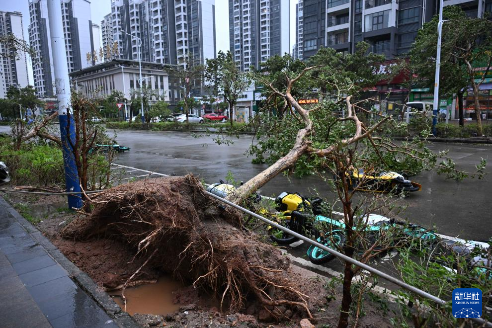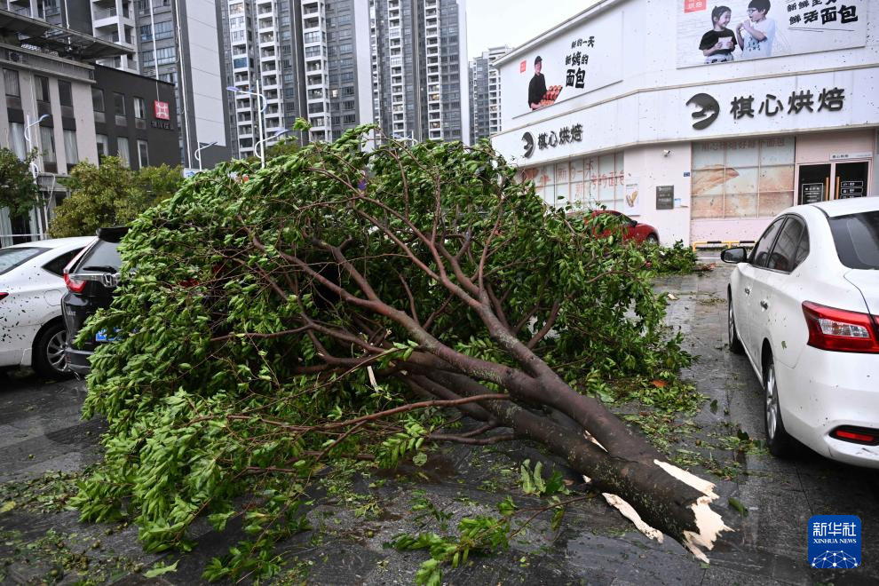 9月24日,在广东阳江市江城区横一路,被风吹断的树枝落在一家饭店门外。新华社记者邓华摄