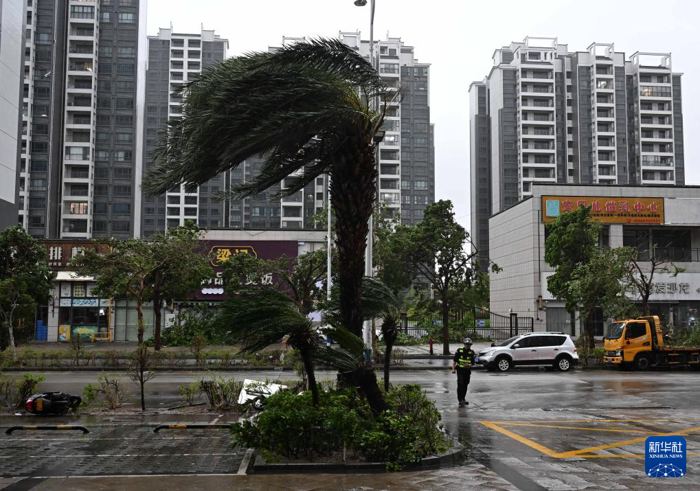 9月24日,在广东阳江市江城区横一路一家酒店外,保安查看设施损毁情况。新华社记者邓华摄