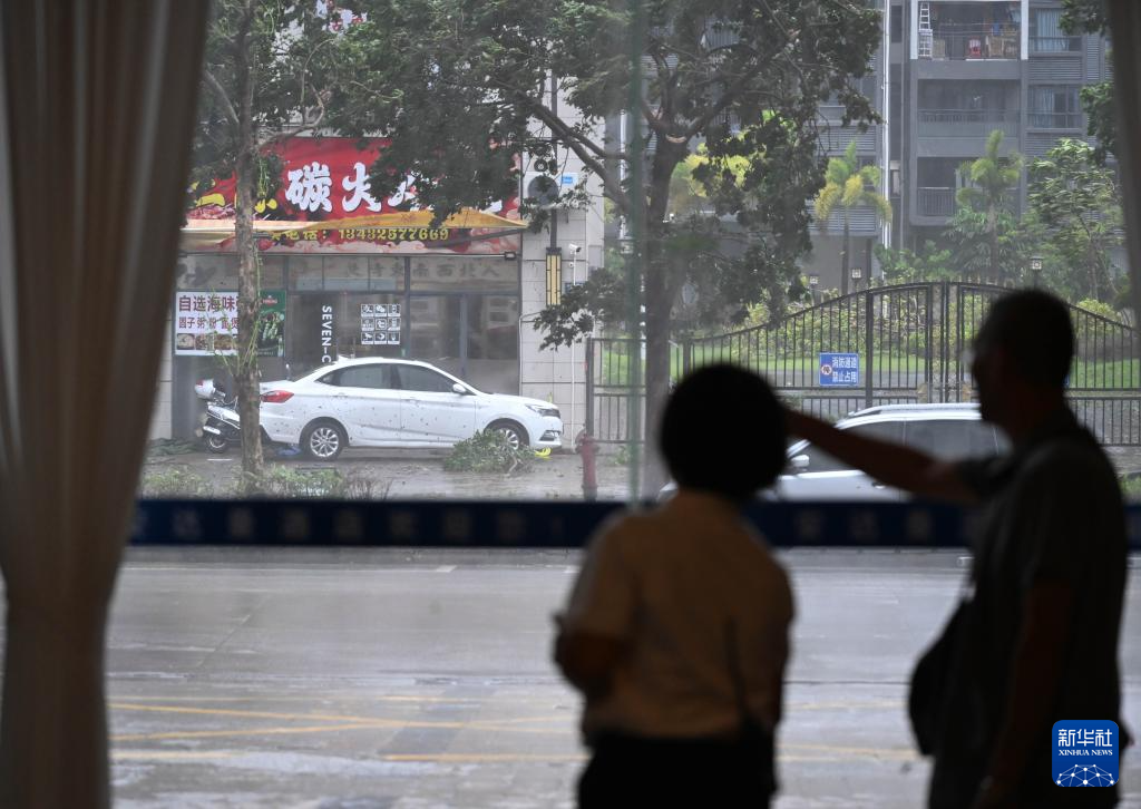 9月24日,在广东阳江市江城区横一路的一家酒店,住客和工作人员向窗外观看。新华社记者邓华摄