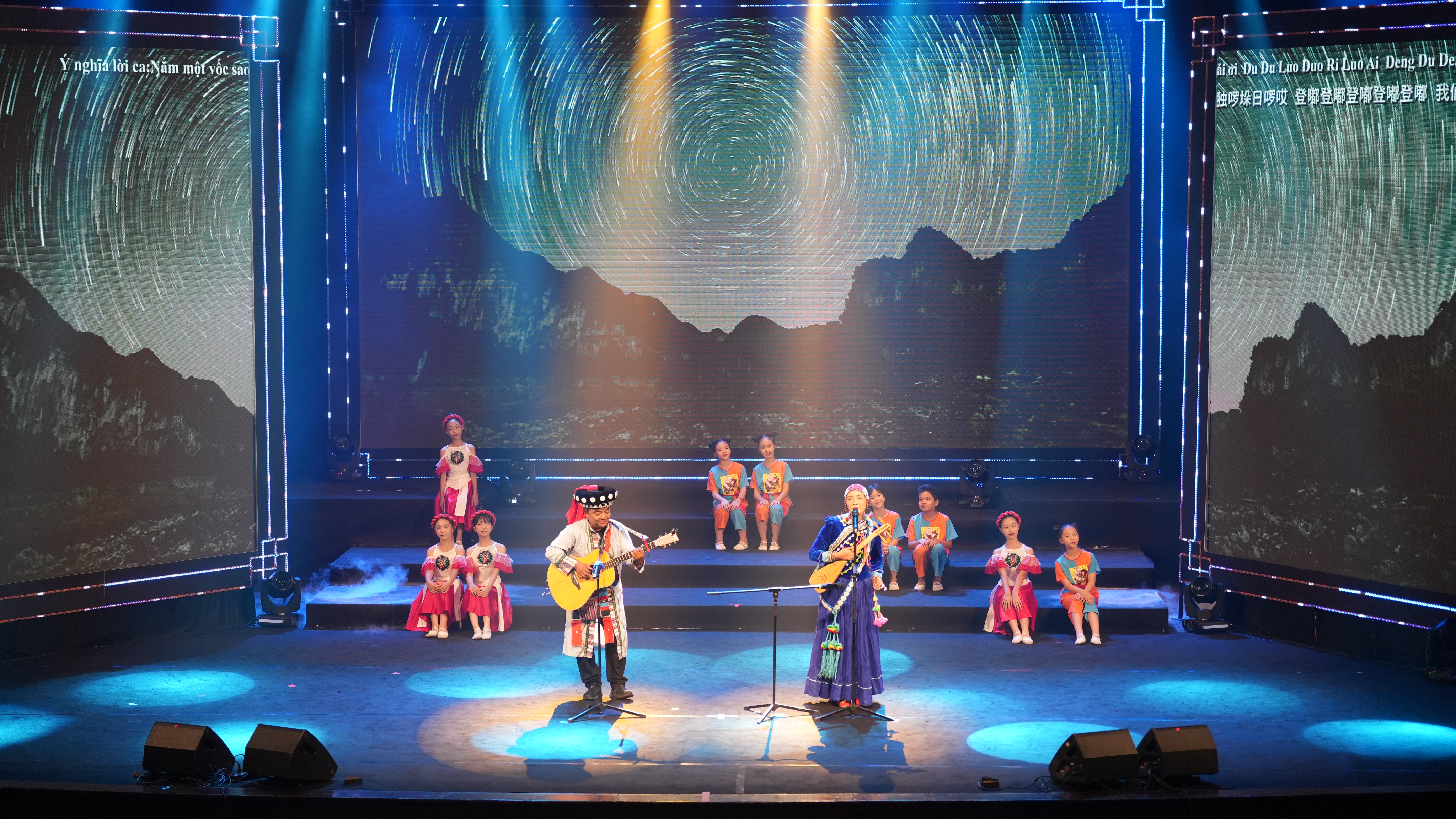 9月25日,在越南河内越南国家歌舞剧院,来自中国云南的演员在2025年中越中秋文艺晚会上合唱歌曲。