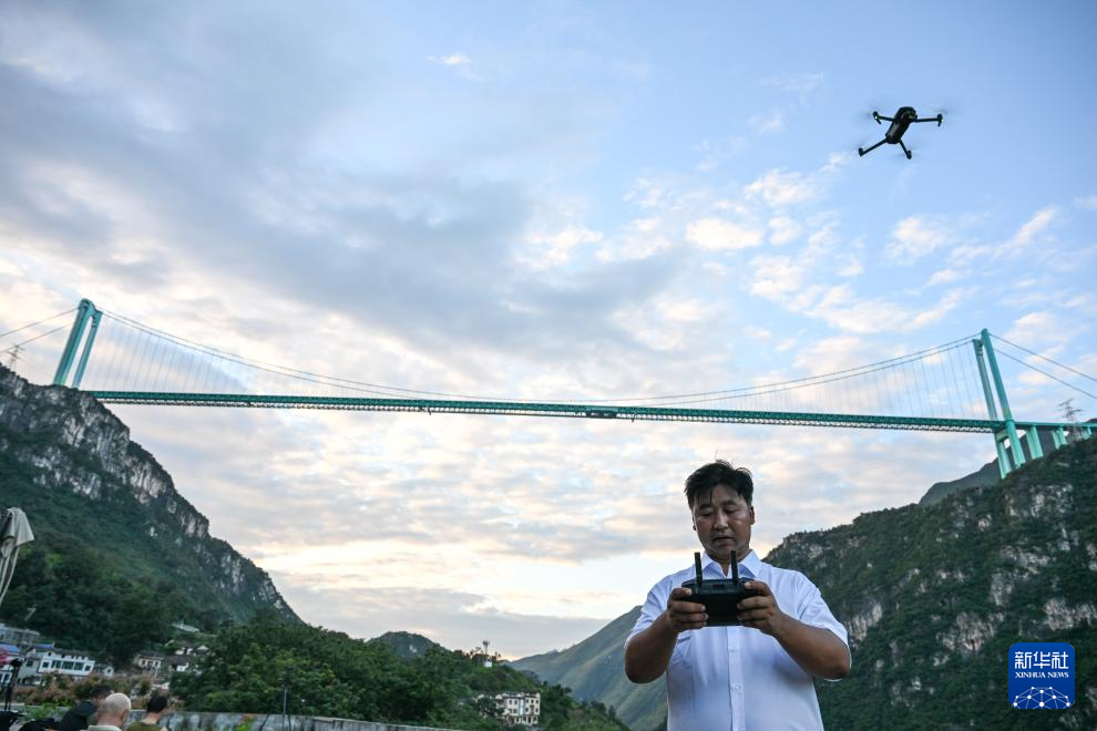 9月27日,在贵州省贞丰县平街乡花江村,自媒体博主谢朝卿在花江峡谷大桥旁操作无人机。新华社记者 杨文斌 摄