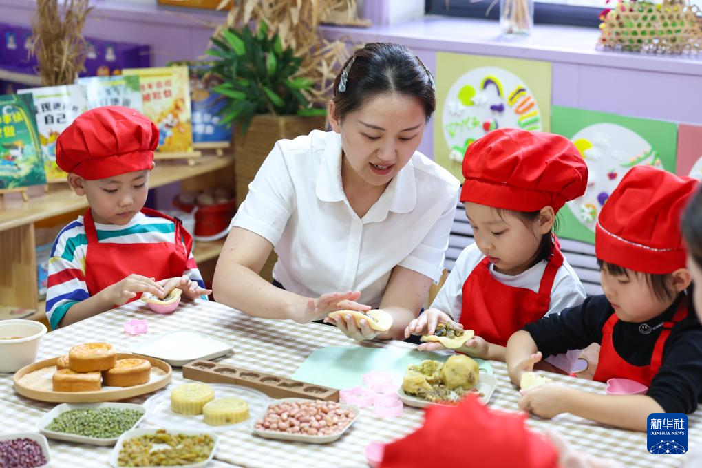 9月29日,河北省石家庄市藁城区通安幼儿园小朋友在老师的指导下学做手工月饼。新华社发(梁子栋摄)