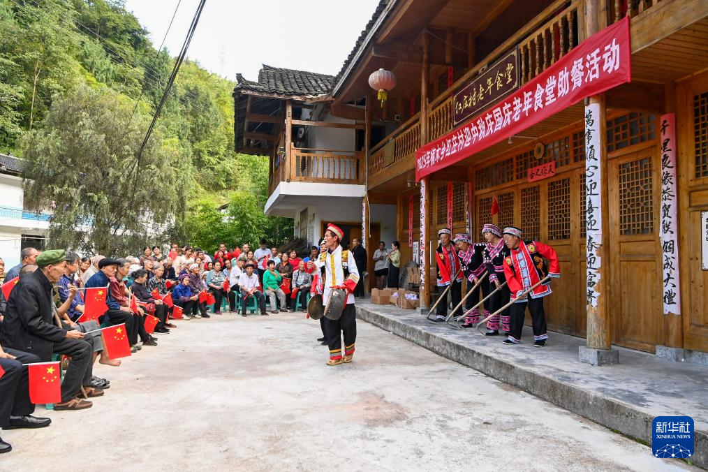 9月28日,在重庆市酉阳土家族苗族自治县楠木乡红庄村老年食堂,艺人为村民表演。新华社发(邱洪斌摄)
