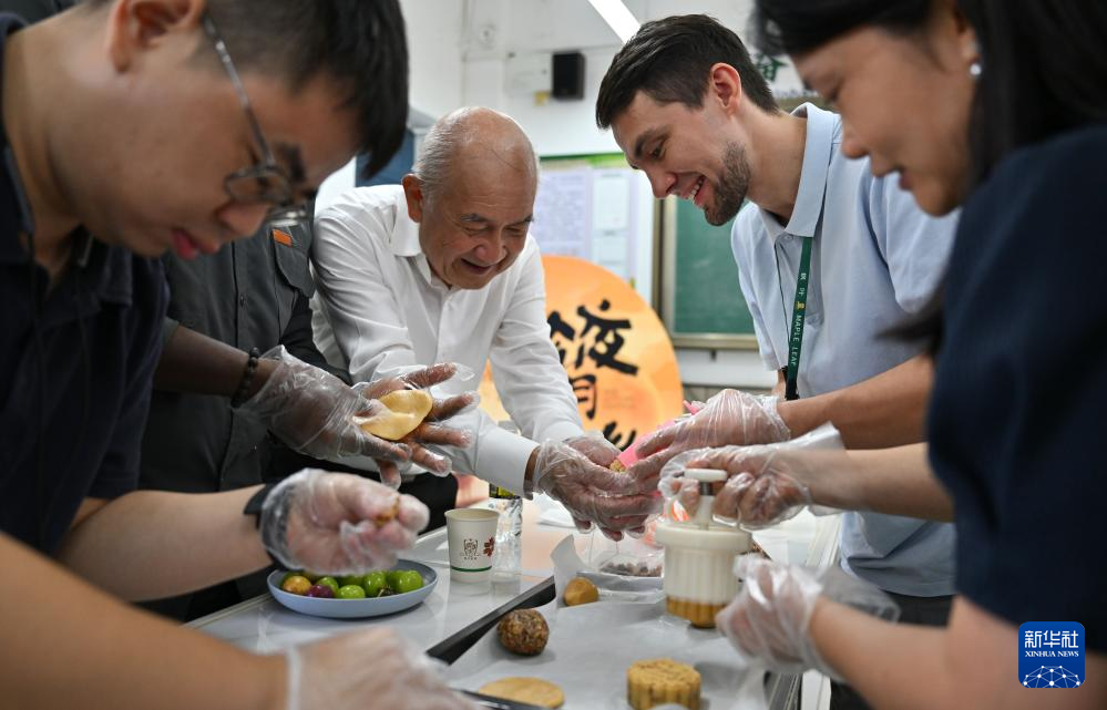 9月30日,在海口市外事办公室举办的中秋文化交流活动中,中外友人在体验月饼制作。新华社记者 郭程 摄
