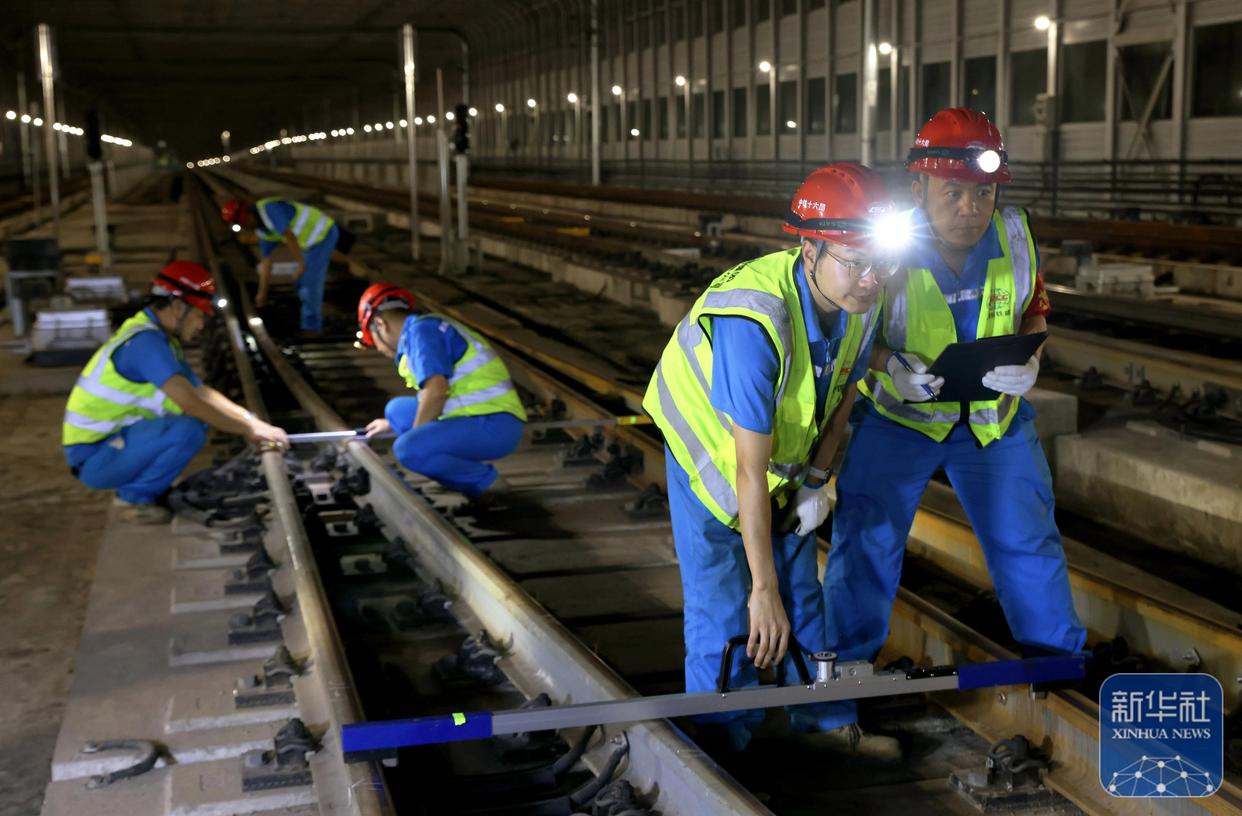 ↑ 10月4日,中铁十六局铁运公司维保人员在重庆轨道交通十八号线检测钢轨轨距。新华社发(付玉忠 摄)