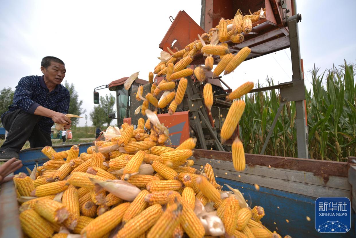 ↑ 10月4日,在山东省聊城市茌平区贾寨镇,村民将收割的玉米装车。新华社发(赵玉国摄)