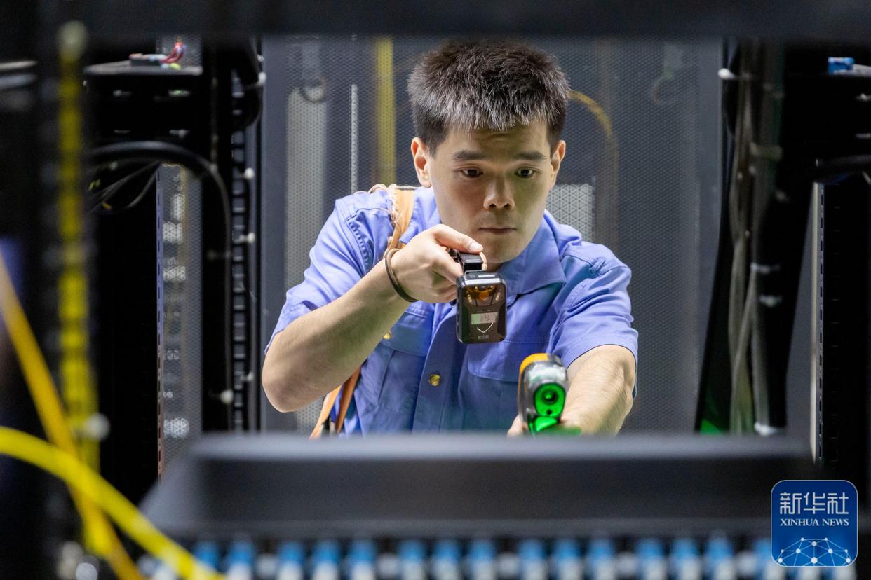 ↑ 10月4日,中国铁路上海局集团有限公司上海电务段信号工张骏绅在查看服务器运行情况。新华社记者 王翔 摄