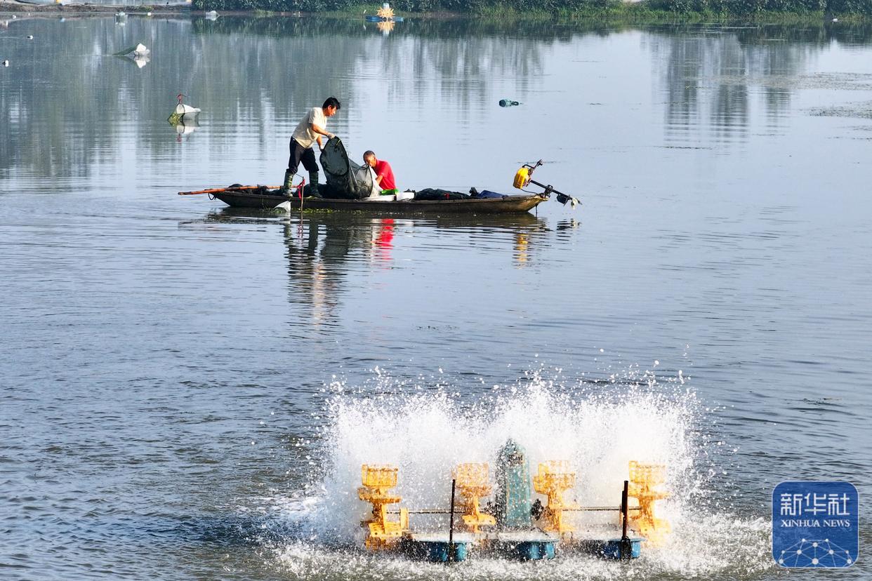 ↑ 10月4日,蟹农在江苏省宝应县夏集镇王营村养殖基地捕捞螃蟹(无人机照片)。新华社发(沈冬兵摄)