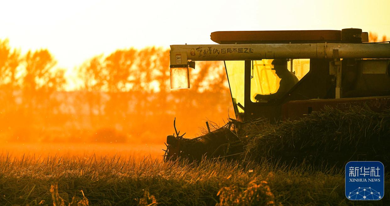 ↑ 10月3日,农户在北大荒集团黑龙江八五六农场有限公司第五管理区抢收水稻(无人机照片)。新华社发(黄永兴摄)