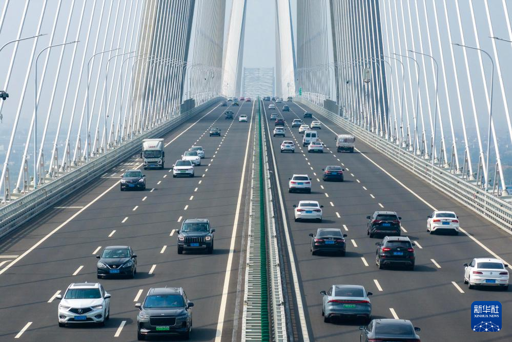 10月7日拍摄的江苏常泰长江大桥车流(无人机照片)。新华社发(汤德宏摄)