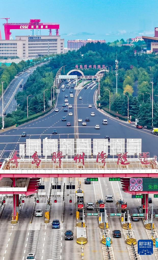 10月7日拍摄的山东青岛胶州湾隧道车流(无人机照片)。新华社发(张进刚摄)