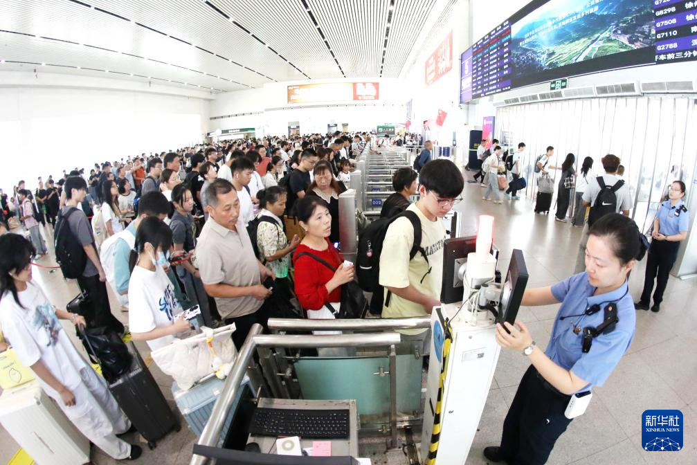10月8日,旅客在安徽阜阳西站候车大厅排队准备检票乘车。新华社发(卢启建摄)