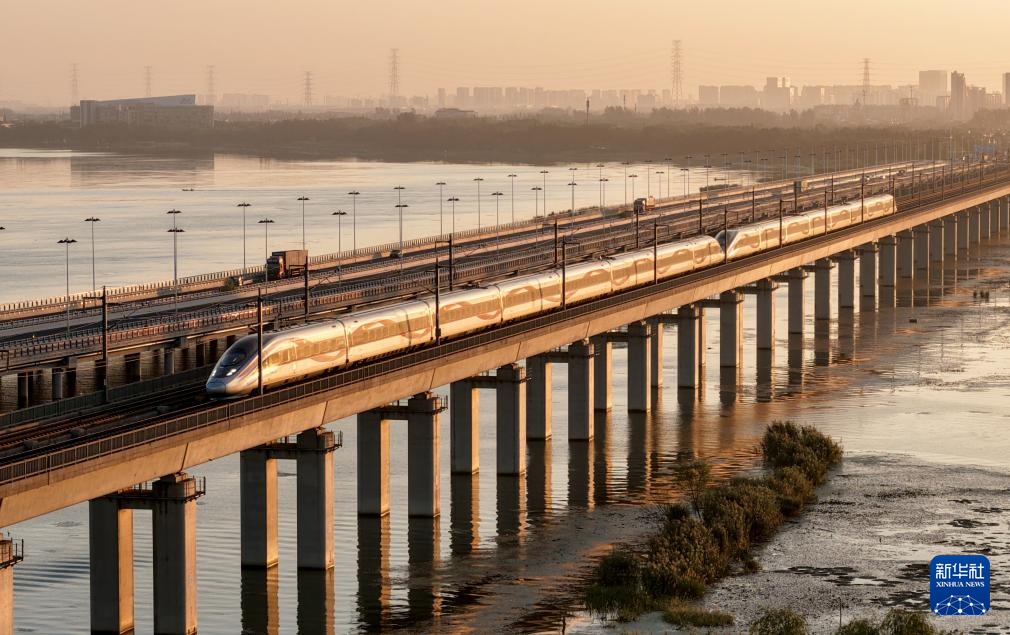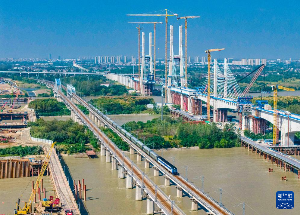 10月10日在江苏南京拍摄的行驶中的动车组列车(无人机照片)。新华社发(苏阳摄)