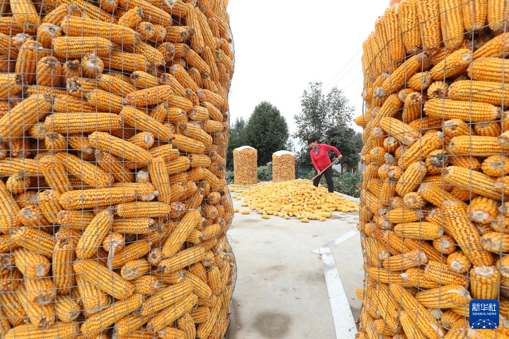10月11日,河北省唐山市丰润区丰润镇卢各庄村农民整理收获的玉米。新华社发(朱大勇摄)